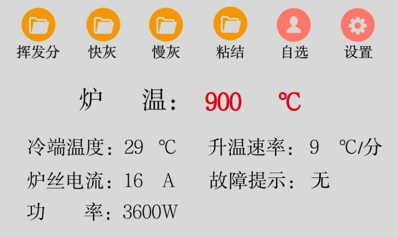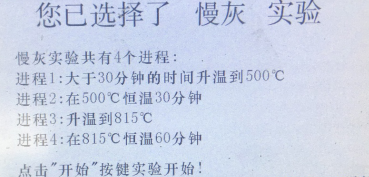 打開灰揮測定儀主界面選擇慢灰實(shí)驗(yàn),進(jìn)入慢灰實(shí)驗(yàn)界面。待爐溫小于100℃,打開爐門將裝有煤樣的灰皿(分析煤樣重量:1±0.1g)送入爐內(nèi)恒溫區(qū),打開煙筒,關(guān)閉爐門且安裝灰份座(使?fàn)t門保留15mm縫隙),點(diǎn)擊開始按鈕。進(jìn)程顯示“1”,爐內(nèi)溫度開始慢慢上升。當(dāng)溫度到達(dá)499℃后自動進(jìn)入進(jìn)程2,在500℃恒溫30min。時間到后自動進(jìn)入進(jìn)程3,爐溫繼續(xù)從500℃升到815℃。溫度達(dá)到后自動進(jìn)入進(jìn)程4,在815℃溫度下恒溫1h,時間滿足后,慢灰實(shí)驗(yàn)結(jié)束,蜂鳴器智能提醒,點(diǎn)擊結(jié)束按鈕,結(jié)束本次實(shí)驗(yàn)。打開爐門將試樣平穩(wěn)取出。